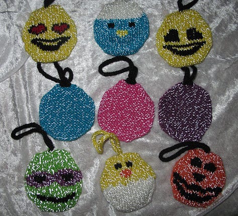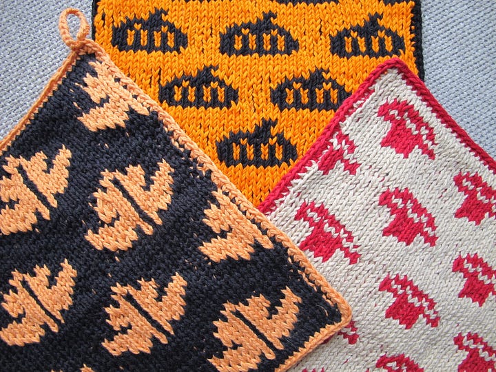 My second autumn inspired pattern was published in October 2023 as well. This time I made 3 charts with autumn inspired motifs for potholders. I have had homemade potholders for my kitchen all my life. I made some myself many years ago and have been gifted some. After I started making my own design it was very important to me to make authentic items and publish patterns on items I will use myself. I have switched to my potholders with the leaves now after using a some with a summer color the last few months. The motifs are pumpkins (of course….), mushrooms and a larger leaf. You can use any cotton yarn on these, but it is very important that it is cotton so the item can be used as it is supposed to. Pure cotton can handle the heat, and when it’s stranded colorwork they also become thicker because of the strand that is carried and the strand that is knitted on every stitch. You can put some isolating fabric between them before closing. I have not done that with mine, but I am very used to using potholders like this. I have been using similar items all my life. They are knitted on needles 4 mm/ US 6 using double strand of thinner cotton yarn in each color, or one strand of thicker cotton yarn in each color. The whole piece is knitted din stranded colorwork and is finished/ closed with a crochet edge. The link to the pattern is here, and I have made a supporting video for the crochet edge.