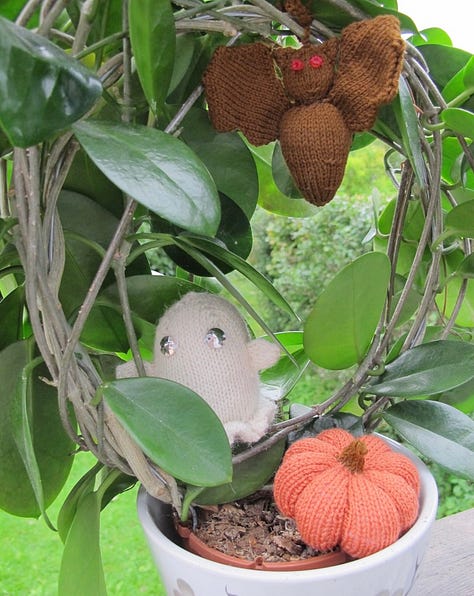 My first published autumn inspired pattern was the Halloween figurines. I had so much fun creating these, but I found it very difficult to write this down. The pumpkin is very easy, the ghost has some more use of techniques, and the bat was the most difficult to write down. It’s only basic techniques, but it has a bit of shaping on the wings. All the figurines come in 3 sizes where the gauge is what makes them different in size. There are some more rows on the bigger ones, but all the techniques are the same. I have used my small figurines as autumn decoration on one of my house plants, and this year I added the two other pumpkins in the window as well. The link to this pattern is here.